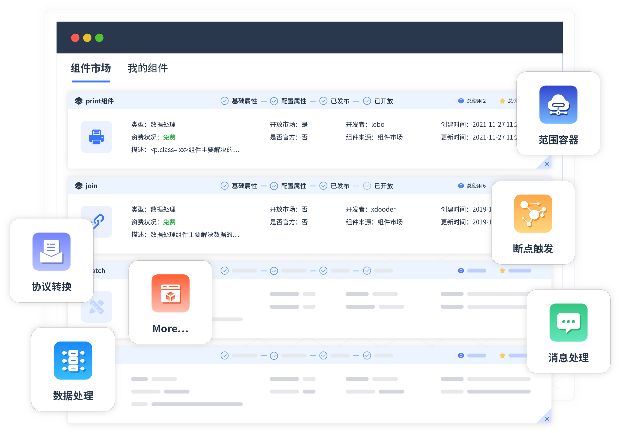 针对集成场景,ng28官网登录入口官方正版官方提供组件市场,例如协议转换、消息处理、文件操作等。除平台提供的组件外,客户可以自定义所需组件。