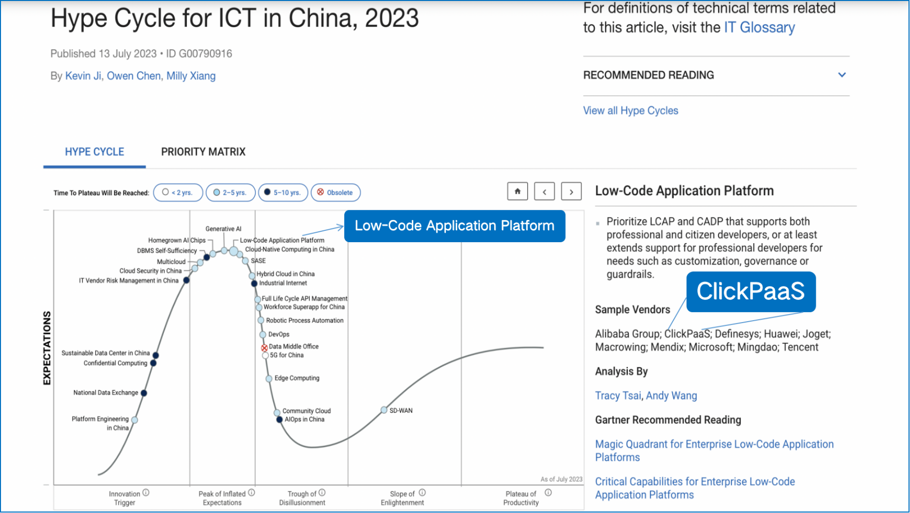 近日,国际权威研究机构Gartner发布了《Hype Cyple for ICT in China,2023(2023年中国ICT技术成熟度曲线)》报告,ng28官网登录入口官方正版官方凭借平台的aPaaS+iPaaS+DaaS保障业务系统的一站式设计,多租户、热发布、国际化、信创安全等特性实力登榜,并作为低代码PaaS平台代表厂商TOP2入选本次报告。